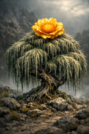 The golden tangler is a stout, shrub-like flower covered in thick, cascading spines. A single large golden flower grows at its crown. Similar in shape to a bonsai willow, its poisonous spines are coated in a fast-acting neurotoxin.